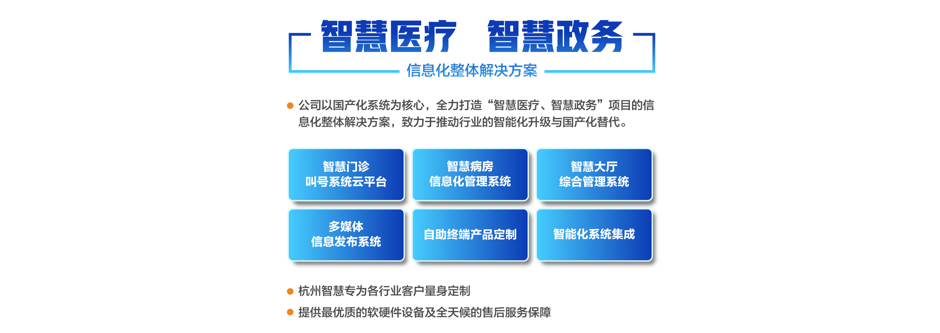 杭州智慧科技有限公司初創(chuàng)于2003年,總部位于重要的電子商務(wù)中心中國杭州公司主營業(yè)務(wù)有:智慧分診叫號(hào)系統(tǒng)、智慧病房醫(yī)護(hù)對(duì)講系統(tǒng)、智慧大廳綜合管理系統(tǒng)、智慧政務(wù)管理系統(tǒng)、智慧多媒體信息發(fā)布系統(tǒng)、導(dǎo)診系統(tǒng)及各自助終端產(chǎn)品定制。專為各行業(yè)客戶量身定制。公司已有20余年行業(yè)經(jīng)驗(yàn)沉淀積累,擁有優(yōu)秀的產(chǎn)品外觀設(shè)計(jì)師和各類中高級(jí)專業(yè)技術(shù)工程師,確保所研發(fā)的產(chǎn)品具有行業(yè)領(lǐng)先的外觀及可靠的技術(shù)性能。并擁有權(quán)威部門頒發(fā)的各類知識(shí)產(chǎn)權(quán)及專利證書,30多項(xiàng)資質(zhì)證書、800多個(gè)合作伙伴、2000多個(gè)項(xiàng)目成功案例經(jīng)驗(yàn)。 智慧產(chǎn)品已遍及全國各醫(yī)療、政務(wù)、金融、通訊、公安、工商、稅務(wù)等行業(yè),形成以“立足杭州、輻射長三角、拓展全國”的戰(zhàn)略發(fā)展格局,產(chǎn)品經(jīng)過歷年不斷創(chuàng)新,形成專業(yè)化、平臺(tái)化,致力于成為智慧產(chǎn)品的領(lǐng)軍企業(yè)。 公司建立了完善的技術(shù)培訓(xùn)及售后服務(wù)中心,并設(shè)24小時(shí)熱線咨詢電話解答用戶反饋的問題。同時(shí)應(yīng)客戶要求定期派技術(shù)人員到 全國各地進(jìn)行技術(shù)指導(dǎo)輔助用戶正確使用智慧產(chǎn)品并能獨(dú)立安裝、調(diào)試、日常維護(hù)等工作。提供最優(yōu)質(zhì)的設(shè)備及全天候的售后服務(wù)保障,智慧永恒不變的服務(wù)宗旨——致力于客戶的滿意與成功!...